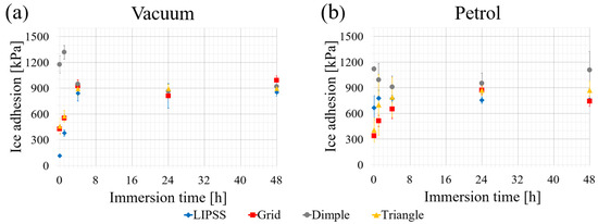Examination of the chemical durability tests indicated that after 1 h of immersion time in acetone, the ice adhesion shear stresses increased significantly in comparison to the initial values for the vacuum-treated samples (Figure 5). In contrast, the petrol-treated samples nearly maintained their initial values even after 1 h of immersion in acetone (LIPSS, grid, and triangle structure). However, the maximum values were reached after 4 h for the vacuum-treated samples (average adhesion of 983 kPa) and after 48 h for the petrol-treated samples (average adhesion of 875 kPa).