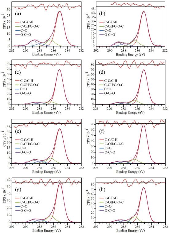 Deconvolution of C 1s peaks, normalized to strongest signals with residual plots on top; (a) unstructured, untreated reference surface; (b) sample C#Ref: structured (LIPSS), untreated reference surface; (c) sample C#RefVac: structured (LIPSS), vacuum-treated surface (4 h); (d) sample C#RefPet: structured (LIPSS), petrol-treated surface (4 h); (e) sample C#1: structured (LIPSS), vacuum-treated (4 h), corroded (48 h, acetone) surface; (f) sample C#2: structured (LIPSS), petrol-treated (4 h), corroded (48 h, acetone) surface; (g) sample C#3: structured (LIPSS), vacuum-treated, corroded (48 h, ethylene glycol) surface; (h) sample C#4: structured (LIPSS), petrol-treated, corroded (48 h, ethylene glycol) surface.
