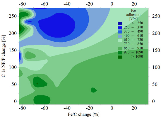 Contour plot of the ice adhesion versus C 1s non-polar/polar ratio and Fe/C change, including all structure types of samples C#1, C#2, C#3, C#4, C#RefVac, and C#RefPet, compared to the untreated laser-structured reference sample C#Ref (zero-reference).