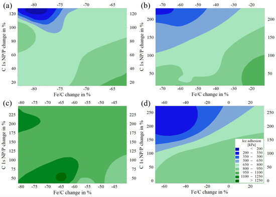 Contour plots of the ice adhesion versus C 1s non-polar/polar ratio and Fe/C change for (a) LIPSS, (b) grid, (c) dimple, and (d) triangle structure including samples C#1, C#2, C#3, C#4, C#RefVac, and C#RefPet, compared to the untreated laser-structured reference sample C#Ref (zero-reference).