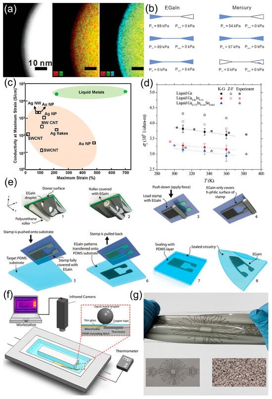 Attributes of Ga-based LMs. (a) TEM images of an EGaIn droplet with a thin Ga oxide layer. Reprinted with permission from [26]. Copyright 2015, John Wiley and Sons. (b) Illustration of the rheological behavior of mercury and EGaIn in a microchannel. Reprinted with permission from [24]. Copyright 2008, John Wiley and Sons. (c) Comparison of conductivity at a maximum strain of various stretchable conductors. Reprinted with permission from [27]. Copyright 2018, John Wiley and Sons. (d) Prediction of the conductivity of Ga, EGaIn, and Galinstan at an increasing temperature. Reprinted with permission from [28]. Copyright 2021, American Chemical Society. (e) Graphical diagram showing the fabrication steps of the complete microcontact-printing process. Reprinted with permission from [29]. Copyright 2019, John Wiley and Sons. (f) Illustration of a cooling system based on Galinstan droplets. Reprinted with permission from [30]. Copyright 2016, American Chemical Society. (g) A LM–elastomer composite. Reprinted with permission from [31]. Copyright 2018, Springer Nature.