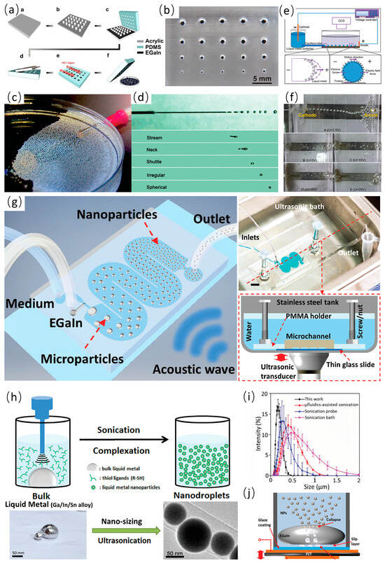 An ultrasonic bath, a sonication probe, and nebulization are three effective types of sonochemical synthesis experimental equipment to fabricate Ga-based LMDs. Tang et al. developed a microfluidics-based system for efficiently preparing EGaIn droplets in a solution environment using acoustic wave-induced forces (Figure 2g). The droplet size can be easily regulated by adjusting the microchannel dimensions. With the exception of an expensive sonication probe, the acoustic wave-induced droplet formation technique is suitable for any ultrasonic bath equipment [61]. Compared with an ultrasonic bath, a sonication probe requires conventional bulky and expensive high-power probes, while it can deliver a larger power density than an ultrasonic bath (probe sonication < 100 W/L and bath sonication > 100 W/L). Therefore, a sonication probe achieves higher efficiency for generating nano-sized metal droplets (Figure 2h) [68]. Nevertheless, high-power density induces a temperature skyrocket, causing undesired oxidation and dealloying during the process of Ga-based LMDs generation. Meanwhile, probe sonication introduces acoustic cavitation, i.e., the formation, growth, and implosive collapse of bubbles, which can greatly shorten the service life of a device [68,69]. By contrast, nebulization can obtain a metal droplet diameter of no more than 500 nm, which is approximately two times smaller than the sonication probe and ultrasonic bath methods (Figure 2i) [70]. Tang et al. showed a vapor cavity-generating ultrasonic platform for nebulizing LM within aqueous media by inducing vapor cavities and collapsing them at the LM–medium interface. This strategy enables the production of stable and functional EGaIn droplets in just one step (Figure 2j) [67]. Although ultrasonic technology has many advantages in fabricating Ga-based LMDs, it cannot ensure droplet size uniformity, and the cost of ultrasonic occurrence equipment is relatively high.