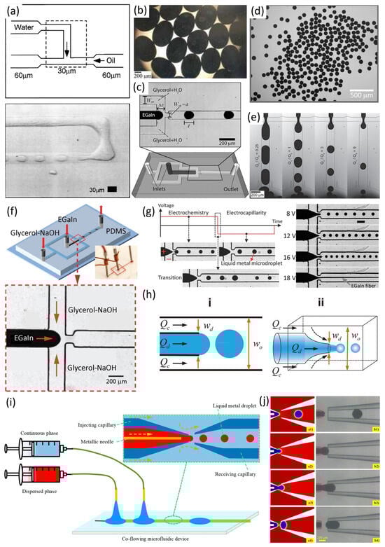 Microfluidic methods for Ga-based LMDs’ preparation. (a) Schematic of the microchannel structure and photomicrograph of two-phase flows’ interaction at the point of a cross-flow. Reprinted with permission from [71]. Copyright 2001, American Physical Society. (b) Optical microscopy images of axiolitic EGaIn droplets. Reprinted with permission from [76]. Copyright 2019, John Wiley and Sons. (c) A model and photomicrograph of the flow-focusing microfluidic device for EGaIn droplets’ fabrication. (d) Microscopy image of monodisperse EGaIn droplets after adding the surfactant of PVA. Reprinted with permission from [77]. Copyright 2012, ROYAL SOCIETY OF CHEMISTRY. (e) A series of photomicrographs depicting the EGaIn droplet fabrication at different flow rate ratios. Reprinted with permission from [78]. Copyright 2012, John Wiley and Sons. (f) A model and a photomicrograph of the experimental setup for EGaIn droplets’ generation with electrical control. (g) Electrochemical and electrocapillary control of the droplet size and fabrication rate of EGaIn in a microchannel. Reprinted with permission from [79,80]. Copyright 2015, John Wiley and Sons. Copyright 2021, ADVANCED INTELLIGENT SYSTEMS. (h) Schematic of the co-flow channel geometry. Reprinted with permission from [72]. Copyright 2017, ROYAL SOCIETY OF CHEMISTRY. (i) Schematic diagram of the micro-needle-induced co-flowing microfluidic experimental setup for Ga-based LMDs’ formation. (j) Comparison of Galinstan microdroplets’ generation process between (a1–a4) simulated and (b1–b4) experimental conditions. Reprinted with permission from [62]. Copyright 2020, MDPI.