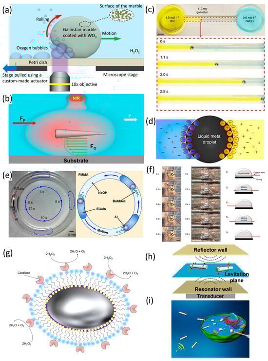 - Zavabeti, A.; Daeneke, T.; Chrimes, A.F.; O’Mullane, A.P.; Zhen Ou, J.; Mitchell, A.; Khoshmanesh, K.; Kalantar-zadeh, K. Ionic imbalance induced self-propulsion of liquid metals. Nat. Commun. 2016, 7, 12402. [Google Scholar] [CrossRef]