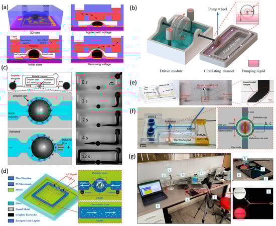 Compared with mechanical pumps, due to the high integration of LM non-mechanical pumps, it can greatly improve the convenience of detection devices based on a microfluidic chip. Hence, LM non-mechanical pumps attract wide attention from scientists. As shown in Figure 8c, Tang and coworkers demonstrated a pump that replaced mechanical moving parts with a galinstan droplet, which is called an LM-enabled pump, for driving a range of liquids upon the application of a modest electric field [58]. This pumping behavior is achieved by applying an electric field to metal droplets to induce electrowetting/deelectrowetting effects on their surface. The proposed LM-enabled pump shows the unique advantages of high efficiency and simple manufacturing. It fundamentally promotes the development of highly integrated microfluidics system. However, the LM enable pump can only be employed in a limited solution, such as neutral sodium chloride and sodium hydroxide, etc. For this reason, Xue et al. further expanded the pumping scope of the solution sample of the LM-enabled pump, that is, the pumping of ionic liquids via LM-enabled electrocapillary under DC-biased AC forcing (Figure 8d) [130].