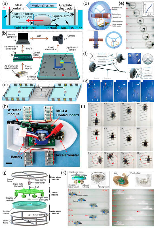 - Wu, J.; Tang, S.Y.; Fang, T.; Li, W.; Li, X.; Zhang, S. A Wheeled Robot Driven by a Liquid-Metal Droplet. Adv. Mater. 2018, 30, 1805039. [Google Scholar] [CrossRef]