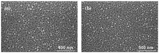 The Si substrate and mica substrate were sonically cleaned in acetone, absolute ethanol, and deionized water for 30 min to remove oily stains and surface particles. Then, the substrates were shake–dried on a glue homogenizer and placed in the glue oven to dry. PZT films and LaNiO3 electrodes were fabricated by the spin–coating method. The LaNiO3 precursor solution was spin–coated onto mica substrate and Si substrate at 4000 rpm for 30 s. The LaNiO3 layer was treated at 180 °C and 380 °C for 5 min, respectively. Then, the LaNiO3 layer was pre–annealed at 750 °C for 5 min. The above process was repeated until the desired LaNiO3 electrode thickness was obtained. Crystalline LaNiO3 electrodes were obtained by annealing at 750 °C for 30 min. The surface field–emission–scanning electron microscopy (FE–SEM) images of LaNiO3 electrodes deposited on the mica substrates and Si substrates are shown in Figure 2. The LaNiO3 electrodes crystallized well and grew densely on the mica substrates and Si substrates, which laid a foundation for the growth of PZT films. Finally, the PZT precursor solution was spin–coated onto LaNiO3–based Si substrates and mica substrates, respectively. The PZT films were obtained by annealing at 700 °C to 800 °C. The deposition process of producing PZT films can be referred to in the literature [21].