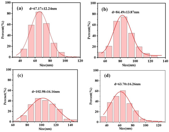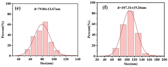 Figure 3 displays the surface and cross–sectional FE–SEM images of PZT films grown on the different substrates with different annealing temperatures, and Figure 4 displays the histograms of grain size distribution and average grain size values of the PZT films obtained from Figure 3 using a nano measurer. The PZT films are well crystallized without cracks, and the grain size is uniform. As the annealing temperature increases from 700 °C to 800 °C, the grain size of the PZT films grown on silicon substrates gradually increases from 67.17 nm to 102.98 nm, while that of the films grown on the silicon substrates increases from 63.70 nm to 107.31 nm. The changing trend of the PZT films grown on the mica substrates is the same as that of the films grown on the silicon substrates. But the films gradually begin to form pores, which is mainly caused by the high annealing temperature [22]. An appropriate annealing temperature is beneficial for the crystallization of PZT films. The structure of the PZT films annealed at 750 °C is dense, and the grains grew well, indicating that the optimal annealing temperature of the as–prepared PZT films is 750 °C. According to Figure 3g,h, the PZT films grew densely with a thickness of about 630 nm. Poor contact between PZT films and silicon substrates due to poor adhesion between PZT films and silicon substrates resulted in separation of the film and substrate during the cutting process.
