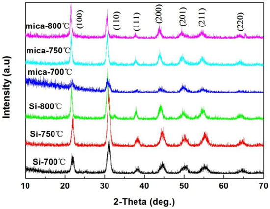 The G–XRD patterns of the as–prepared PZT films deposited on the Si substrates and mica substrates with different annealing temperatures are displayed in Figure 5. All the diffraction peaks belong to the perovskite structure of the PZT films, and no pyrochlore or second phase was found. The diffraction peak intensity of the as–prepared films first increases and then decreases with the elevation in annealing temperature from 700 °C to 800 °C. The diffraction peak of the PZT films grown on the Si substrate shifts towards lower 2θ values at 800 °C, which may be caused by the significant volatilization of the lead element.