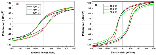 P–E loops of the as–prepared PZT films deposited on the different substrates with different annealing temperatures at 100 Hz are shown in Figure 6. With the boosting of the electric field, the polarization value of the as–prepared films elevates nonlinearly and exhibits good ferroelectric properties. The remanent polarization value of the PZT films first increases and then decreases with the elevation in annealing temperature. However, the coercive field first decreases and then increases. The PZT films deposited on the mica substrates have larger remanent polarization values and coercive fields than that deposited on Si substrates. The grain size of the PZT films gradually grows with the increase in the annealing temperature to 750 °C, and the domain size is relatively large, which leads to the increase in polarization of the PZT films [23]. Unfortunately, the ferroelectric properties of the PZT films decrease with the increase in temperature to 800 °C. The PZT films gradually begin to form pores with the increase in the annealing temperature to 800 °C, and the presence of some pores creates the depolarizing field, leading to a decrease in polarization of the films [24]. According to Formula (1), the residual stress of the PZT films grown on the mica substrates decreases, resulting in the generation of more non–180° domains, which is significant to the boosting of the remanent polarization value of the PZT films [25].
