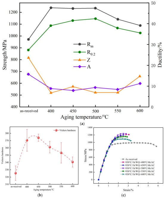 Effect of aging treatment on mechanical properties of Ti-5Al-3V-1.5Mo-2Zr titanium alloy drill pipe: (a) tensile property curve, (b) hardness change, (c) stress–strain curve (adapted from [21]).
