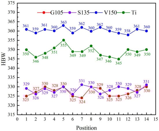 Compared with foreign countries, China’s titanium alloy drill pipe technology started late, but developed rapidly. The titanium alloy drill pipe body is made of Ti-6Al-4V hot-rolled seamless pipe. Designed and processed, the titanium alloy drill pipe has an outer diameter of Φ73.02 mm, wall thickness of 9.19 mm, and length of 9.15 m. The drill pipe body is made of Ti-6Al-4V alloy, which has fatigue strength and high tensile strength, good corrosion resistance, low elastic modulus, and low cost. In addition, Ti-6Al-4V material also has good hot forging, processing, and welding properties. Figure 2 shows the hardness test results of G105, S135, V150, and titanium alloy drill pipe samples. It can be seen from Figure 2 that the hardness distribution of drill pipe is relatively uniform. The elastic model and density of titanium alloy drill pipe are lower than those of steel drill pipe, but the hardness of titanium alloy drill pipe is higher than G105 and S135, which may improve the corrosion resistance of it [39]. The taper transformation in the end wall thickness of titanium alloy-thickened drill pipe can significantly reduce the bending stress at the joint between the drill pipe joint and the drill pipe body, so that the bending stress of the drill pipe joint is evenly distributed along the axial direction, thus greatly improving the fatigue resistance of the titanium alloy drill pipe [57]. Titanium alloy drill pipe is more suitable for complex-trajectory wells with a short radius, long horizontal section, and corrosive environment [39].