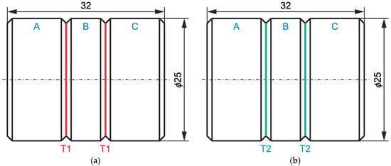 The adhesive joints were made of three separate cylindrical specimens marked as in Figure 4 with symbols A, B, and C. Three specimens of each of types A, B, and C were prepared. Stainless steel X46Cr13 (1.4034) was used as the material for the bonded specimens. Two adhesives were used to bond the samples: T1 epoxy adhesive and T2 cyanoacrylate adhesive, with characteristics given in Table 1.