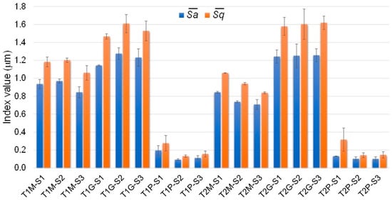 An Altisurf A520 multisensor measurement system (Altimet, Thonon-les-Bains, France) was used to measure the surface topography, which was equipped with a CL2 confocal white light sensor with an operating range of up to 400 μm and a resolution in the optical axis of the instrument of 22 nm. Digital processing of the recorded point cloud and determination of selected values of surface texture indices were carried out using MountainsMap Premium 7.4 software (Digital Surf, Besançon, France). The surface was aligned on LS-plane and the artefact threshold was automatically set below 0.05% and above 99.95% of the core points. The roughness as the S-L surface was extracted on a metrological filter according to ISO 16610-61 [61] with a cut-off size of 0.8 mm. The resulting average values of the measured surface parameters for each specimen are presented in Table 3.