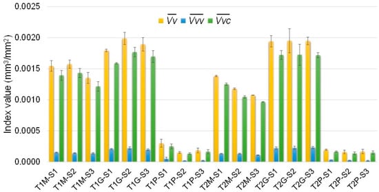 - Vv—void volume per unit area for a given material fraction (mm3/mm2);