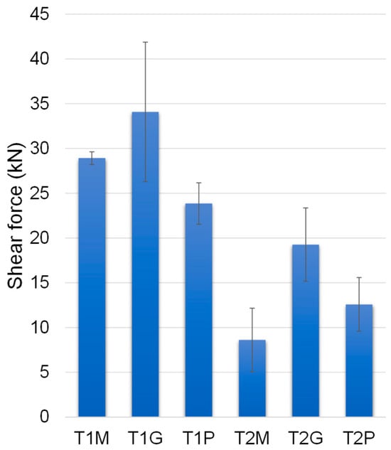 Average shear force values for the study joints (M – milling, G – grinding, P – polishing).