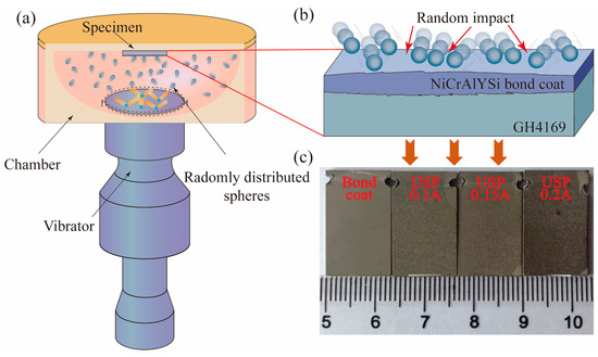 Schematic diagram of USP: (a) USP device, (b) dynamic process of spheres impact, (c) macroscopic morphology of the sample.