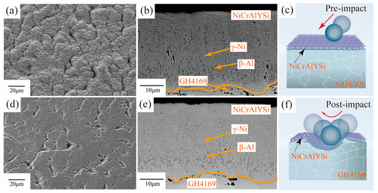 SEM morphology of the samples. (a) Surface of the bond coats, (b) cross-section of the bond coats, (c) schematic diagram before sphere impact coats, (d) surface of the USP sample, (e) cross-section of the USP sample, (f) shematic diagram after sphere impact coats.