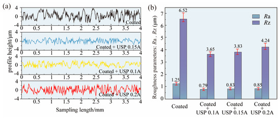 In this study, the measured arithmetic mean deviation Ra values and the microscopic unevenness ten-point height Rz values were used to characterize the changes in surface roughness of the coated specimens before and after USP treatments (reference Table 2 and Figure 3). As shown in Figure 3b, the surface of the coated specimens without USP resulted in larger values of Ra and Rz compared to the treated specimens, with values of Ra and Rz being 58.2% and 78.6% higher, respectively, under the intensity of 0.1 A; similar results had been obtained in previous studies [7,15]. The main reason for this phenomenon is that the random impact effect of shots introduced by USP on the surface weakens the unevenness of the coating surface caused by the coating particles, reduces the average profile roughness, weakens the protrusions and depressions on the coating surface, and makes the coating tend to be flat. According to the research of Suder et al. (see Figure 6 in [16]), the roughness of the coating surface will affect the aerodynamic efficiency by about 5%. For the USP-treated samples, within a certain range, an increase in peening duration results in an increase in the number of pits and exacerbation of surface protrusions and pits, ultimately leading to an increase in surface roughness. Ra reaches 0.79 μm when the USP intensity is 0.1 A. When the USP intensity increases to 0.2 A, the surface roughness only increases to approximately 0.85 μm, mainly since increasing the USP intensity after the coverage is more significant than 100% has little effect on the surface morphology [17].