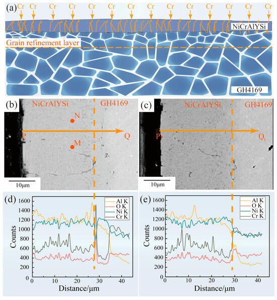 Figure 4 presents the line scan analysis results of the samples at different intensities. Line scans were performed along the PQ and P1Q1 lines to analyze the composition. In the bond coat region near the substrate, enrichment peaks of Cr and O elements are observed. Quantitative analysis of the M and N points in Figure 4b yields the results shown in Table 3. This indicates that, in addition to Al-containing oxides, the bond coat also contains a significant amount of Cr oxides. This is mainly due to the chemical reactions between Al, Cr, and O elements during USP forming a protective layer that prevents further diffusion of O elements into the substrate [18]. As shown in Figure 4d,e, at intensities of 0.1 A and 0.15 A, the content of Cr on the surface area accounts for 13% and 22% of the total elemental content, respectively. This suggests the potential introduction of Cr elements from the GCr15 spheres to the surface of the bond coat samples, which can be further analyzed and verified through comparative experiments using ceramic spheres (ZrO2, Si3N4) or glass spheres. As shown in Figure 4a, during the USP process, the kinetic energy of the spheres is converted into internal stress, inducing dislocation motion and the formation of small-angle grain boundaries and subgrain boundaries within the bond coat, thereby increasing the diffusion pathway for Cr elements [19]. With the Almen intensity increasing, Cr elements within the bond coat migrate towards the surface, and chromium is known to enhance the wear resistance and antioxidative properties of the coated sample surface [20,21,22,23,24].
