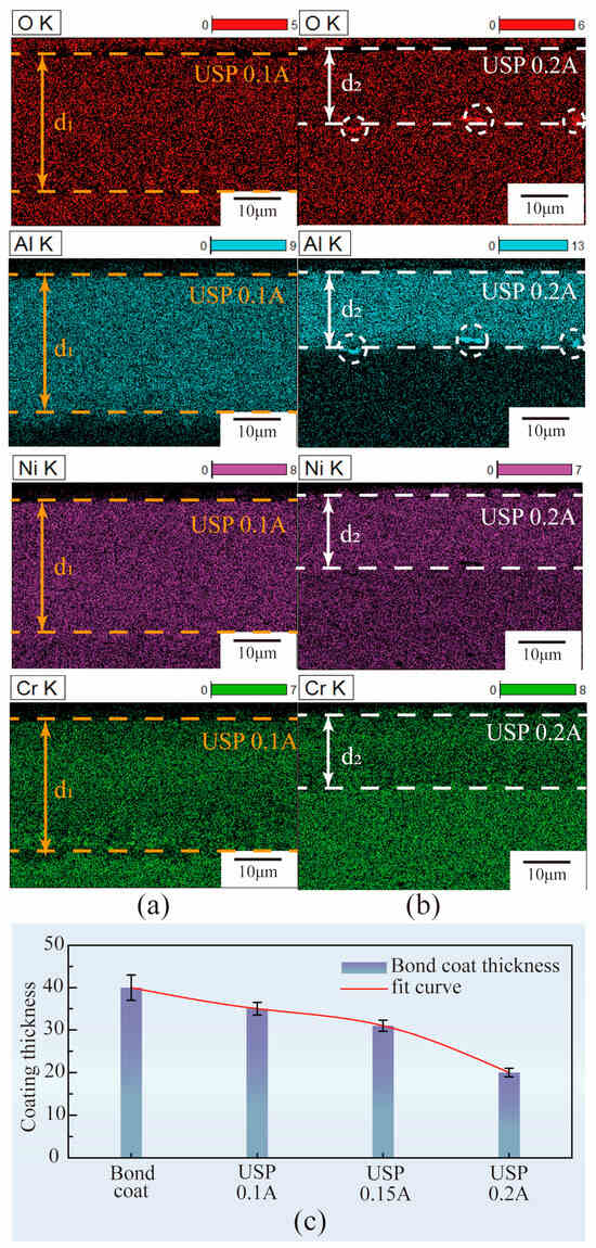 - After USP treatment, the surface of the bond coat incorporates Cr elements from the GCr15 spheres and the surface Cr content increases with increasing intensity. At an intensity of 0.1 A, localized enrichment of Cr elements is observed in the bond coat region near the substrate, indicating the presence of Cr oxides in addition to Al oxides within the bond coat after USP treatment, hindering the diffusion of O elements into the substrate.