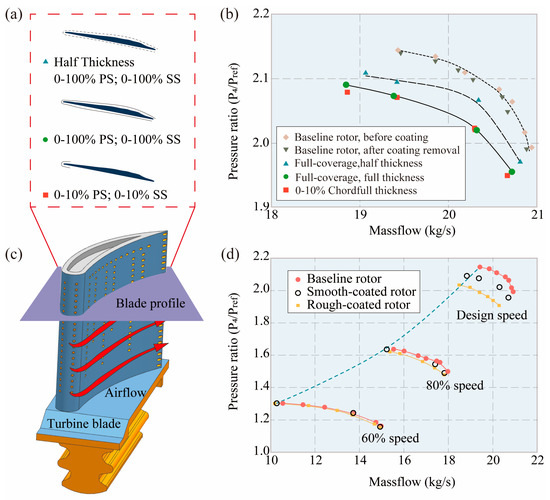 Effects of turbine blade coats thickness and roughness on aerodynamic efficiency. (a) Airfoil section diagram, including half full coverage thickness, full coverage normal thickness, 10% coverage; SS: Denotes suction surface, PS: Denotes pressure surface. (b) Effect of thickness, P4: total pressure, Pref: standard-day total pressure. (c) Turbine blade diagram. (d) Effect of roughness [16].