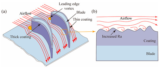 On the other hand, the impact of coating thickness is analogous to the process of “flow around a cylinder” in the context of airfoil shapes [27,28]. In this process, resistance zones appear at the front and rear ends of the cylinder, and the larger the size of the cylinder, the greater the resistance. However, unlike cylinders, airfoils exhibit a characteristic shape with a thicker leading edge and a thinner trailing edge, which reduces the area of the flow resistance zone and enhances aerodynamic efficiency. The thinning of the airfoil coating caused by USP facilitates this enhancement of aerodynamic efficiency resulting from thickness changes. Although this impact is less than 5% [16], it is sufficient to garner attention in engineering applications (as shown in Figure 7a). To this end, further research will be conducted to explore the impact of USP on the aerodynamic efficiency of actual turbine blades. Naturally, this endeavor necessitates the development of more sophisticated USP equipment and the employment of more precise aerodynamic calculation methodologies.