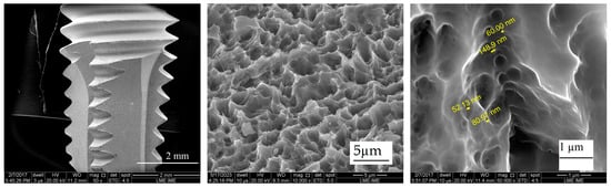 Dental implant surface morphology on the apical region. Surface with micro- and nanocavities (50×, 10,000× and 50,000× magnifications).