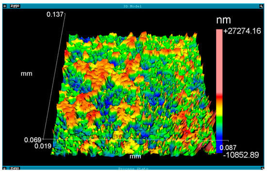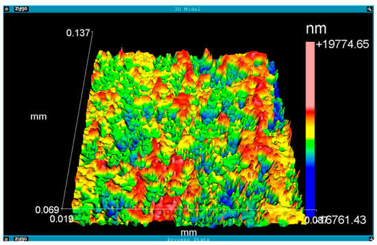 The results were complemented with 3D surface roughness measurements. Roughness analysis was performed by interferometry with the Zygo NewView 7100 optical roughness meter (Zygo Corporation, Middlefield, CT, USA). The implants’ roughness parameters, Ra, Rsk, Rms, Rku, PV, Rpk, Rk, and R3z, were measured. The definitions of the roughness parameters are available in the Technical Standard ISO 21920-2:2021. Although the roughness parameter Ra is the most analyzed in the literature, previous results of the authors of the present work showed that other roughness parameters, such as Rz and PV, have the most significant influence on the osseointegration of dental implants. Three areas of each implant were measured. The interferometry technique produces a 3D image of the measurement region. Roughness measurement with a non-destructive optical interferometer provides a better understanding of surface morphology and roughness than measurements with a contact profilometer.