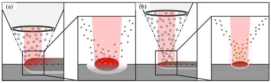 Comparison between process set-ups: (a) conventional DED-LB and (b) EHLA [11].
