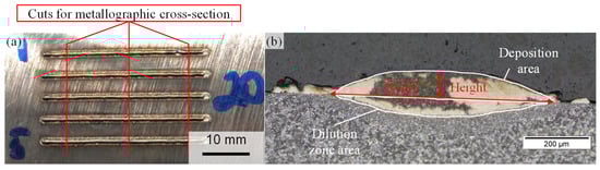(a) Deposited single tracks with indication of the positions for metallographic cross-sections. (b) Example of a single-track metallographic cross-section with evaluation criteria.