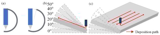 By incorporating a tilt/turn table, the EHLA3D technology enables the coating of free-form surfaces, which are neither planar nor rotationally symmetric, as the orientation of the processing optics can be flexibly set up perpendicular to the processing surface. However, depending on the geometry of the components, interfering contours can prevent the condition of a perpendicular deposition on the processing surface (see Figure 7a). To evaluate the process stability towards non-vertical surfaces, the developed coating parameter was applied on substrates with a variation of the tilting angle between 0° and 50°. The deposition was conducted parallel as well as perpendicular to the rotatory axis (see Figure 7b,c). The coating surfaces were qualitatively evaluated with a Keyence 3D optical profilometer VR-500 and metallographic cross-sections.