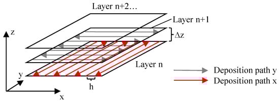 To qualify the process for additive manufacturing and repair applications, the developed coating parameters from stage two were transferred to the deposition of bulk specimens in a third stage. Within the process transfer, the beam power was varied and the average coating layer thickness was defined as the initial ∆z increment for the height adjustment per layer. The correct ∆z increment with which the programmed height matched the actual built height was iteratively reduced and determined. For the bulk deposition, the cross-hatching path-planning strategy was applied (see Figure 8). The specimen geometry had dimensions of 30 mm × 30 mm (W × L) and 20 deposited layers for the high productivity and 60 layers for the low heat input parameter set.