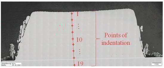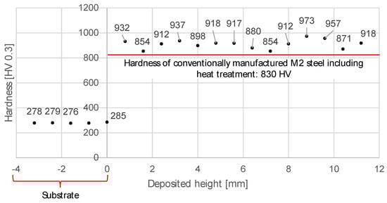After the development and definition of the parameter set for (AM) deposition, a final specimen was deposited with target dimensions of 30 mm × 30 mm and a deposition height of ≥10 mm. In addition to the metallographic evaluation, the final probe was analyzed with SEM to identify micro defects. For the evaluation of the resulting material property, HV hardness measurements according to the DIN EN ISO14577 and DIN EN ISO 6507 with a test load of 300 g were conducted on the final probe specimen. In the scope of the hardness test, the point of indentation was placed on a line over the deposition height (see Figure 10) so that a hardness profile could be measured.
