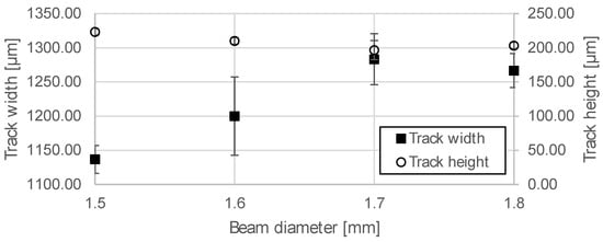 For the evaluation of the influence of the process parameters on the deposition quality, a parameter study was conducted via deposition of single tracks and variation in the process parameters. The dependency between the investigated beam diameter and the resulting single-track geometries is presented in Figure 11.