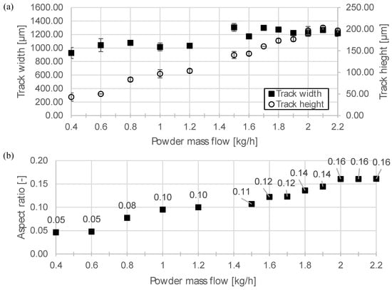 Resulting single-track geometries at different powder mass flows: (a) single track width and height (b) aspect ratios. dB = 1.6 mm; QL = 8 L/min; PL = 2000 W for 0.4 kg/h < ṁ < 1.2 kg/h; and PL = 2600 W for 1.5 kg/h < ṁ < 2.2 kg/h.