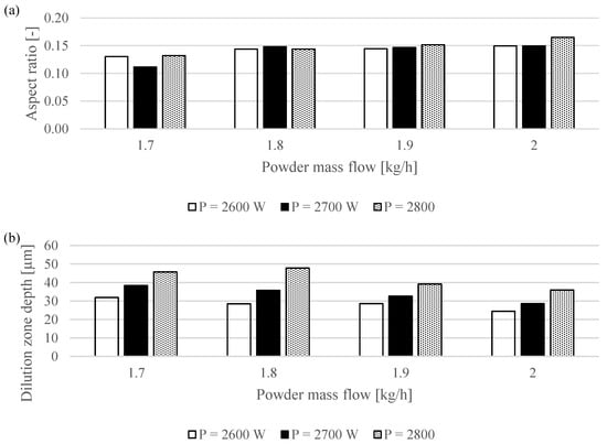 (a) Single-track aspect ratios and (b) dilution zone depths with variation in powder mass flow and carrier gas flows. dB = 1.6 mm; PL = 2600 W.