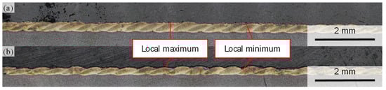 By decreasing the hatching distance, a smoother coating surface with smaller thickness deviation can be achieved. However, bonding defects are incorporated when a low hatching distance is applied, since the prior deposited weld bead is not fully melted (see Figure 17).