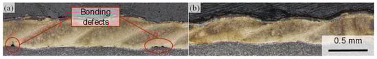 Bonding defects at the end of a weld track at a low hatch distance. (a) h = 0.5 and (b) h = 0.6 with the ṁ = 1.9 kg/h parameter set.