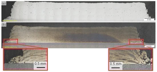 Metallographic cross-section of the bulk specimen deposited with the high productivity parameter set. (a) Polished cross-section and (b) etched cross-section—resulting porosity: 0.34%.