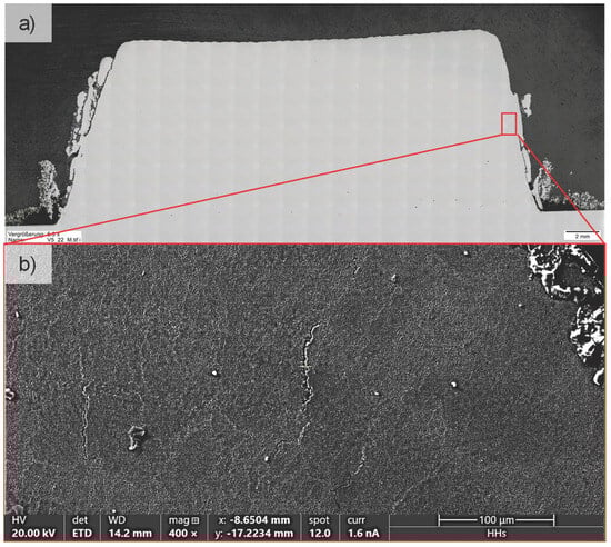 (a) Metallographic cross-section of a bulk specimen with 250 deposited layers—porosity: 0.04 %. (b) SEM image of the edge area with identified micro hot cracks.