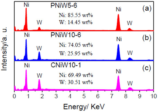 The composition of three samples was analyzed by EDS, and the results are shown in Figure 5. The characteristic peaks of the Ni and W elements all appear, indicating that the co-deposition of Ni and W occurred in the pyrophosphate bath [27]. The content of W in Ni-W alloy coatings is improved from 14.45 wt.% of the PNiW5-6 sample to 25.96 wt.% of the PNiW10-6 sample, when the concentration of Na2WO4·2H2O is enhanced from 50 to 100 g L−1. The W content can be further improved to 30.51 wt.% of the CNiW10-1 sample by decreasing applied CD, but surface cracks appear, as shown in Figure 1a.