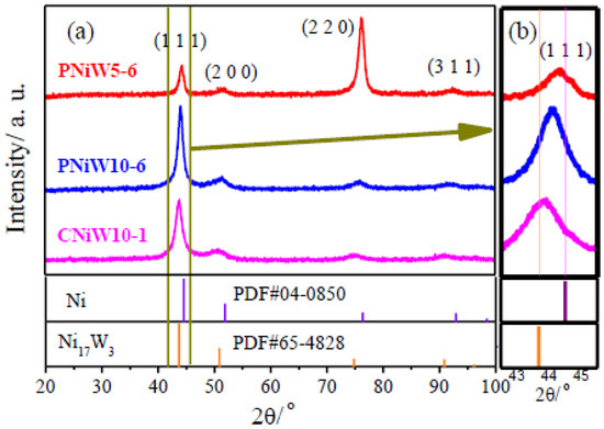 (a) XRD patterns of porous Ni-W alloys of the PNiW5-6 and PNiW10-6, and crack Ni-W alloy of CNiW10-1, and (b) the corresponding magnified patterns.