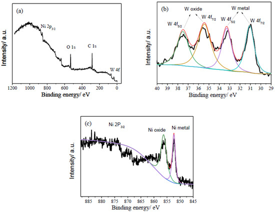 XPS was performed to analyze the composition and chemical states of the PNiW10-6 sample, and the results are shown in Figure 7. As shown in Figure 6a, the sharp signals of O 1s and C 1s and weak peaks of Ni 2P and W 4f are detected in the XPS full spectrum, likely because of the existence of the adsorption of CO2 or the formation of oxides on the surface of the porous Ni-W alloy. In Figure 7b, the high-resolution W 4f XPS spectrum presents four peaks at 31.06 eV and 33.26 eV for the W metal [29,30] and 35.46 eV and 37.46 eV for the tungsten oxides of NiWO4 or WO3 [19,29,30]. For Ni 2P 3/2, two peaks centered at 852.48 eV and 856.27 eV are assigned to the Ni metal and Ni2+, respectively [29,30]. Therefore, the W4f and Ni 2P XPS spectrum of the PNiW10-6 sample shows that surface Ni and W are both in an oxidized (in the form of Ni2+ and W6+, respectively) and atom state.
