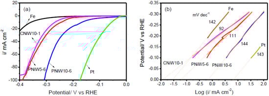 Figure 8a shows the LSV curves of three Ni-W alloy catalysts, the Fe and Pt disk after iR correction. Obviously, the Pt electrode exhibits superior electrocatalytic activity. As expected, the Fe electrode presents the poorest alkaline HER performance. In comparison with PNiW5-6, PNiW10-6 possesses greater electrocatalytic activity, attributed to a higher pore density, higher W content and the synergistic effect of nickel and tungsten.