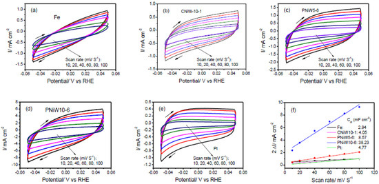 Cyclic voltammetry (CV) curves recorded on the (a) Fe, (b) CNiW10-1, (c) PNiW5-6, (d) PNiW10-6 and (e) Pt electrodes in 1.0 M NaOH solution between −0.05 and 0.05 V at different scan rates of 10, 20, 40, 60, 80 and 100 mV s−1. (f) The relationship between the difference of positive and negative scan current at 0 V (2 Δi) and scan rate, the calculated Cdl according to the corresponding slope is also shown.