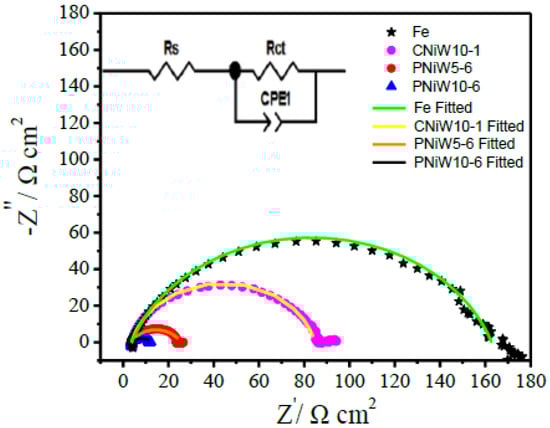 The enhanced alkaline HER activity mechanism was further investigated via an EIS test at an overpotential of 230 mV, where numerous hydrogen bubbles detached from the surface of catalysts. As shown in Figure 9, one compressed semicircle is observed in all Nyquist plots, indicating that all samples underwent the same electrochemical reaction process. An equivalent circuit model with one time constant shown in the insert was utilized to fit the Nyquist plots, and the results are listed in Table 5. The diameter of the semicircle indicates the polarization or charge transfer resistance (Rct), Rs is solution resistance and CPE-T is constant phase element (CPE), being related to Cdl. As seen from Figure 10 and Table 5, the Rct of the reaction at PNiW10-6 is 9.30 Ω cm2, which is lower than that of at PNiW5-6 (22.07 Ω cm2), and much lower than that of at the crack CNiW10-1 sample (80.38 Ω cm2) and the Fe substrate (124.84 Ω cm2), suggests that the PNiW10-6 electrode possesses the fastest HER kinetics.