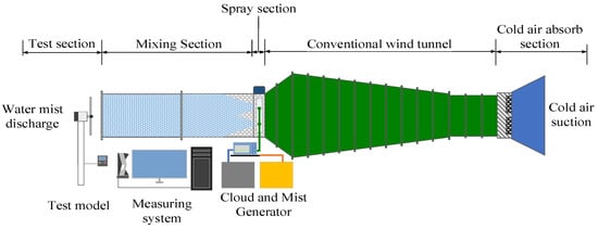 Figure 1 illustrates a schematic diagram of the icing wind tunnel test system that was designed and employed in this study. Situated in Northeast China, characterized by cold and extended winters, the laboratory introduced cold air into a standard wind tunnel during the winter season. Building upon this configuration, a naturally low-temperature icing wind tunnel was developed [28,29]. Through this experimental setup, a series of icing tests were performed on wind turbine blades [30,31].