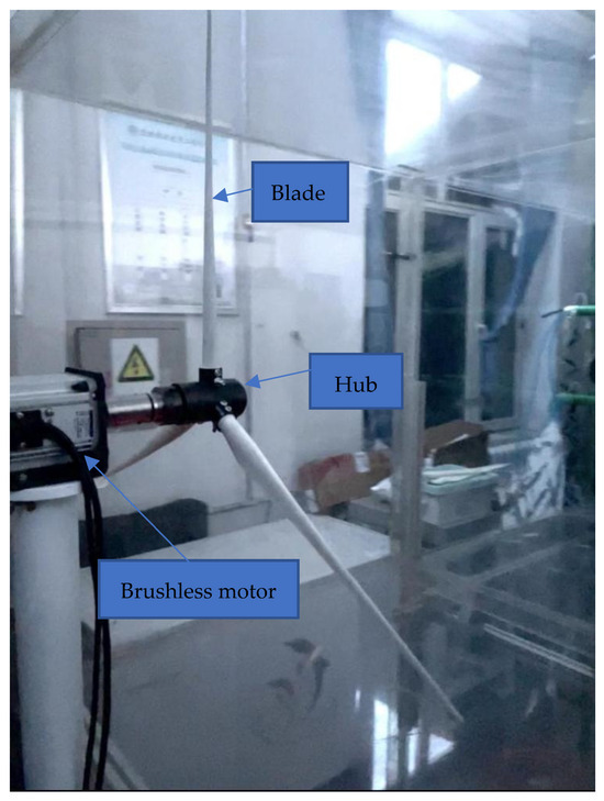 Figure 2 illustrates a schematic diagram of the downscaled wind turbine model utilized in the icing wind tunnel experiments. The model operates at a scale ratio of 100:1, featuring a rotor diameter of 0.8 m and blade length of 0.37 m. The central hub is constructed from 45 quenched and tempered steel, while the blades are fabricated using nylon material with a surface roughness of 0.05 mm by employing 3D printing technology. Each blade is affixed to the hub using two bolts, and the hub and blades are linked to a permanent magnet brushless variable frequency motor through a key coupling. The motor, with a power rating of 450 W and a torque of 1.23 N·m, delivers a constant torque output regulated by a controller to uphold a consistent rotational speed of the wind turbine model within the wind tunnel. The motor is securely mounted on a stand to the ground, ensuring alignment of the rotational center of the model with the center of the test section at the wind tunnel exit.