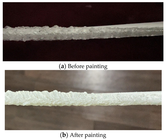 The transparency and refraction of ice pose challenges in determining the central axis of the laser beam emitted by a 3D laser scanner when it irradiates the ice surface. This difficulty hinders effective scanning of the ice and impacts ice shape measurement. To address this issue, it is essential to apply a contrast agent on the ice surface before scanning to improve its reflectivity. This enhancement allows the scanner to recognize the surface characteristics of the ice. However, many commercially available contrast agents for 3D scanning contain ethanol, which is added to ensure volatility and leave white traces. When ethanol interacts with ice, it causes melting, leading to the mixing of melted water with ethanol. This mixture inhibits the proper evaporation of ethanol, diminishing the effectiveness of the contrast agent. In this research, a coating based on titanium dioxide was utilized. It was uniformly sprayed onto the ice surface using a spray gun [26]. The ice surface both before and after the application of the contrast agent is illustrated in Figure 4.